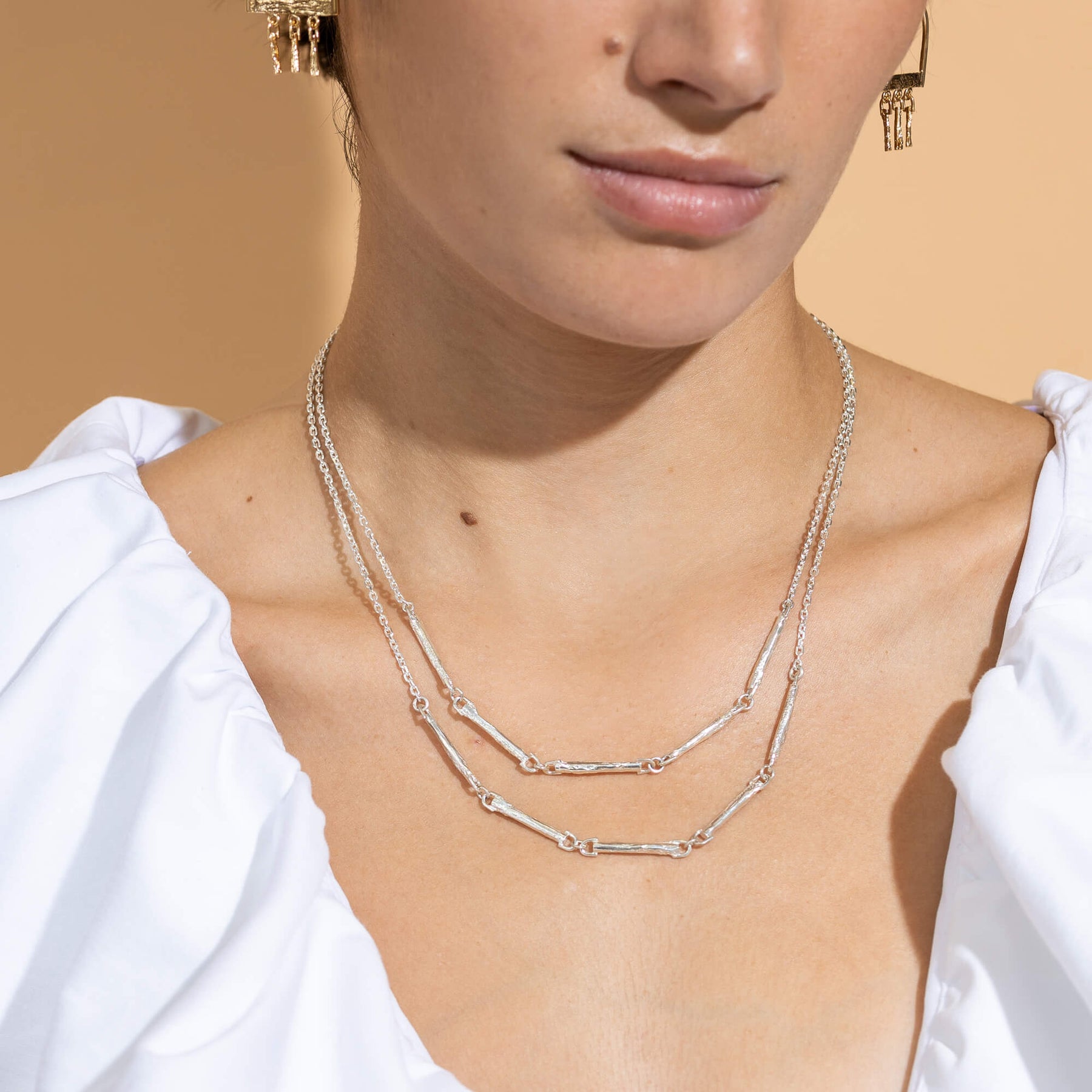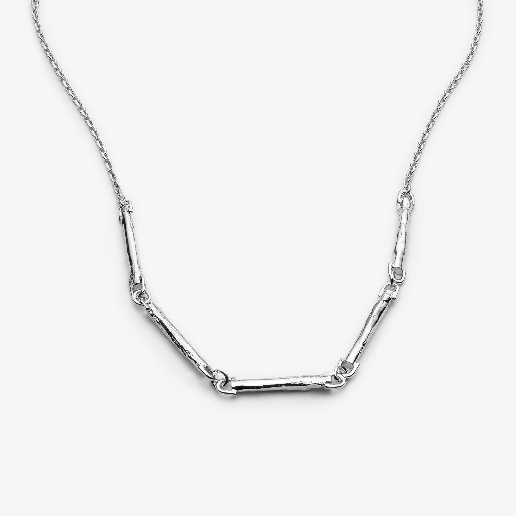 Voici une simple chaîne en argent sterling, avec de petites tiges d'argent texturé. Ce bijoux est fait à la main, au Québec, par l'artisane joaillière montréalaise, Lidia Raymond.