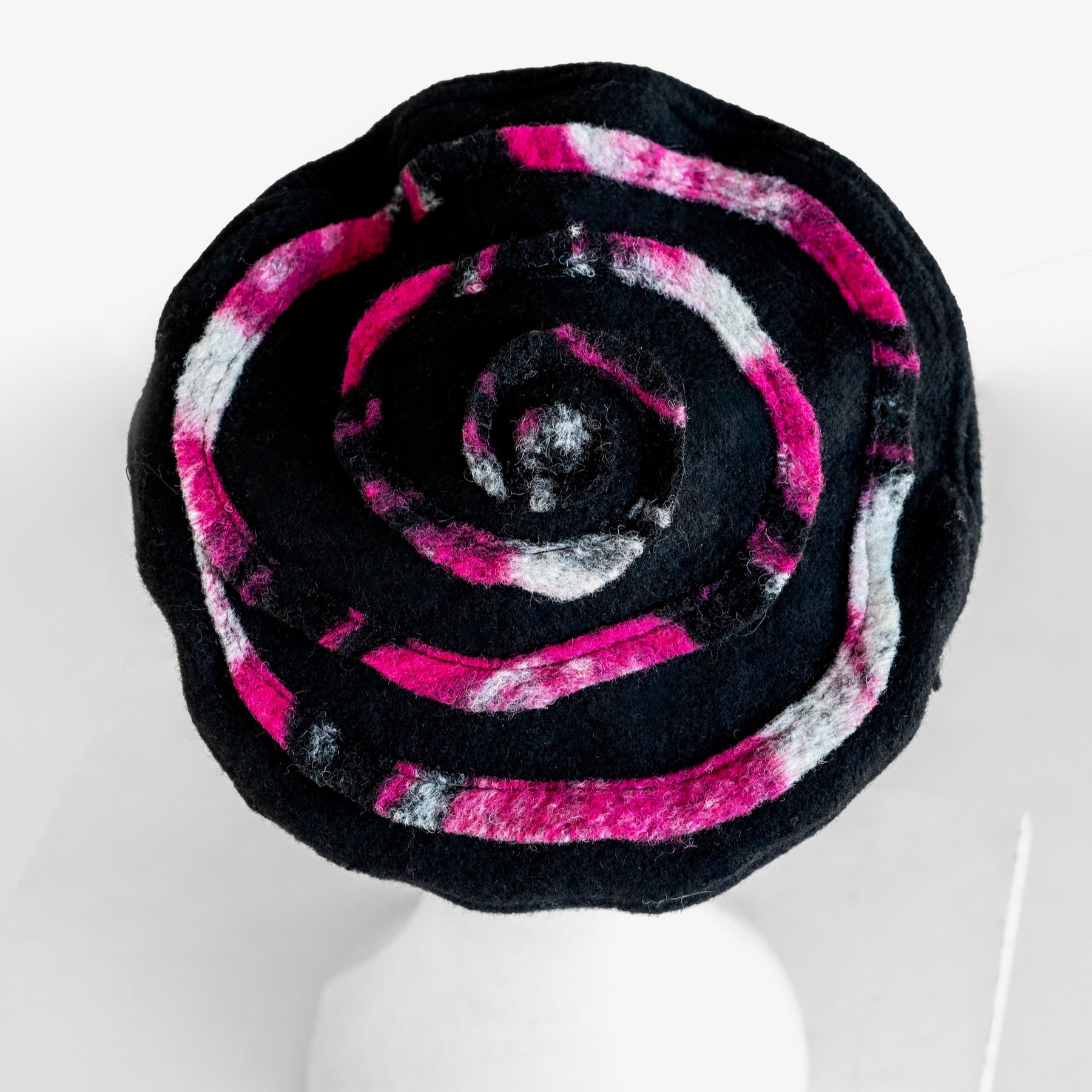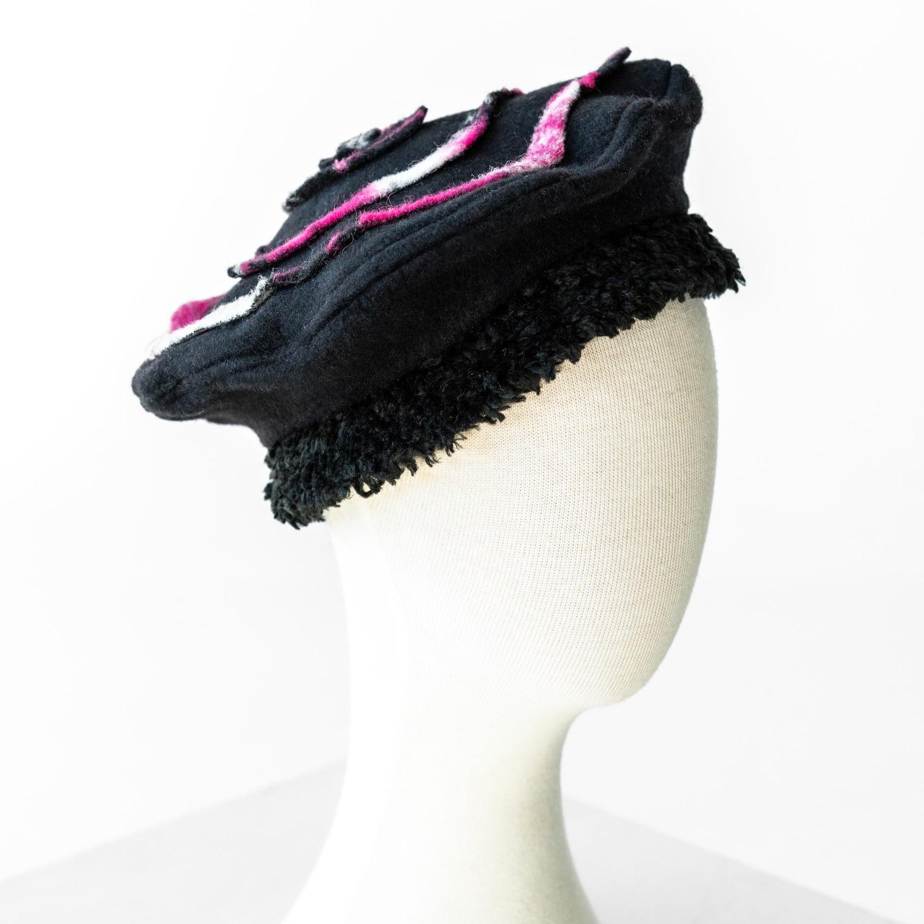 A beret handmade in Montreal from wool-blend fabric, to keep you warm. The pink spiral adds a feminine and singular touch.