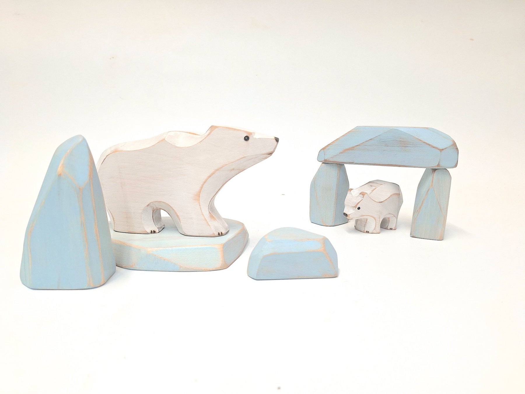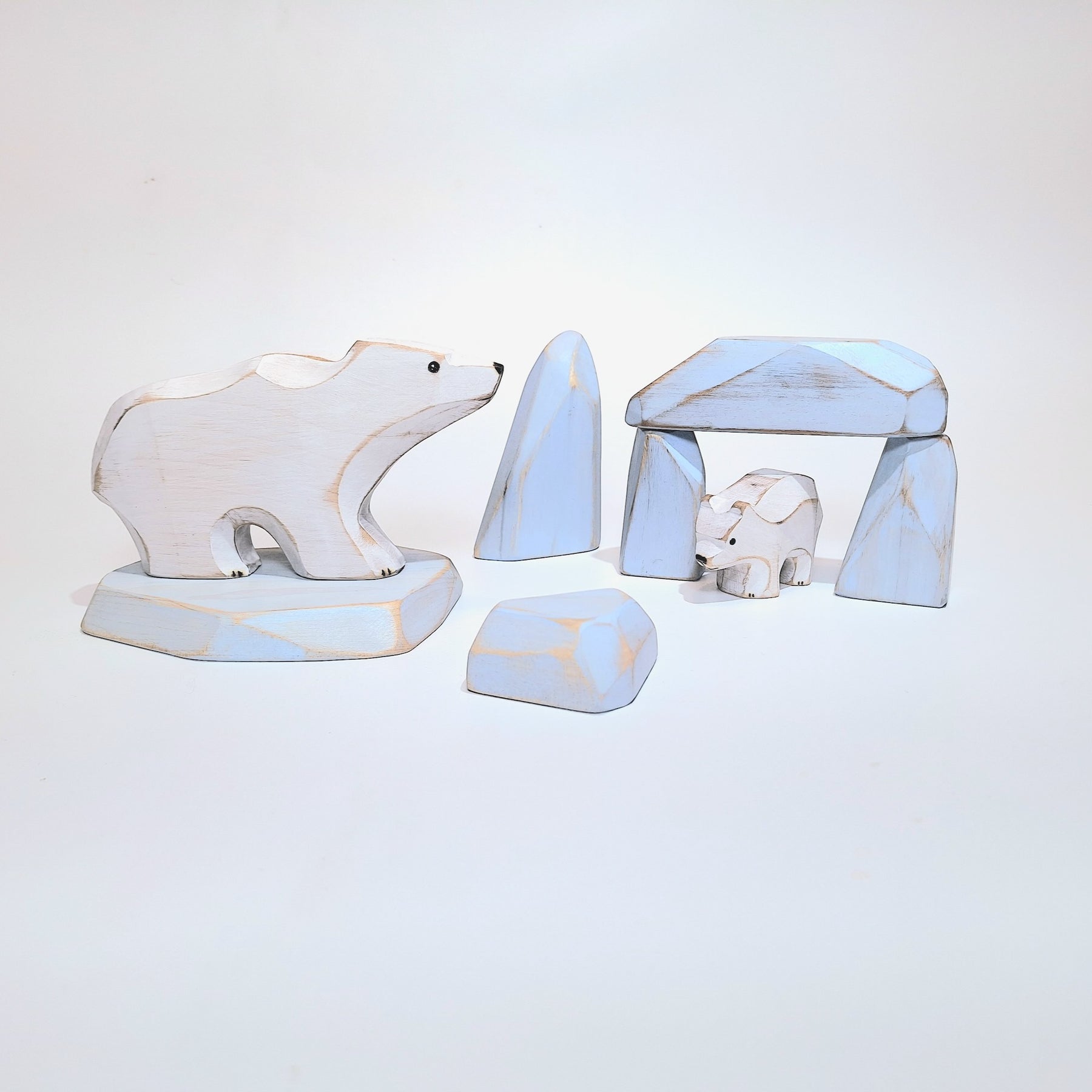 The set includes three glaciers, a large plaque, a small plaque, a mama bear and a baby bear.
